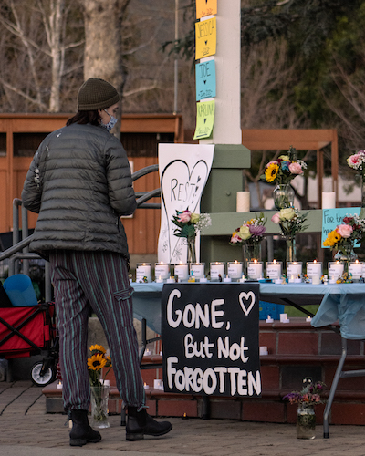 The vigil wraps to a close as attendees are invited to light a candle and place a lego figurine in memory of the deceased. Uncertainty hangs in the night.